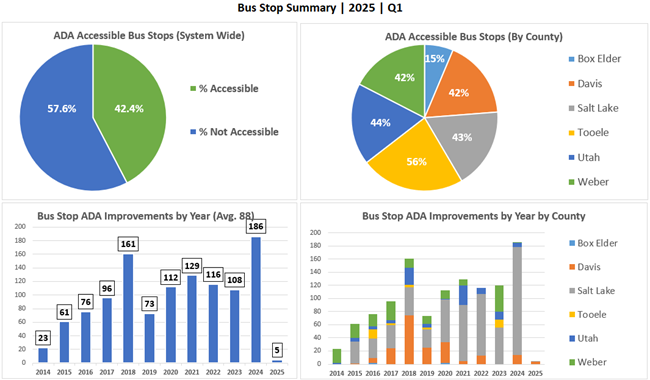 UTA will improve and build over 100 bus stops across the Wasatch Front over the next several months, including in Weber, Davis, Salt Lake, and Utah counties. Work began in September 2024 and will continue through March 2025.